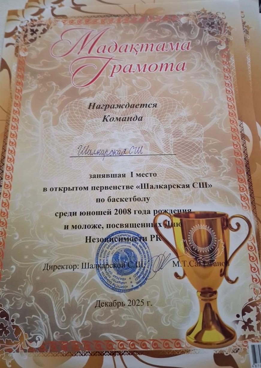 В соревнованиях по баскетболу в открытом первенстве ,,Шалкарская СШ,, среди юношей 2008 г.рождения и моложе, посвящённых Дню Независимости Республики Казахстан приняло участия три команды, ДЮШС село Саумалколь, КСШ с саумалколь и команда Шалкарской сш. 1 место Шалкарская СШ, 2 место ДЮШС, 3 место КСШ